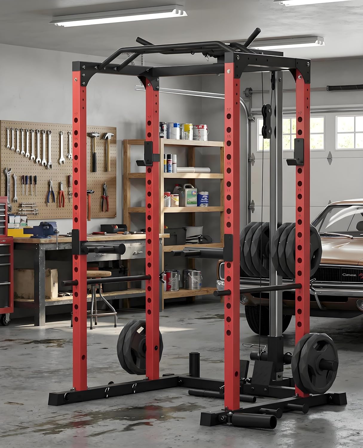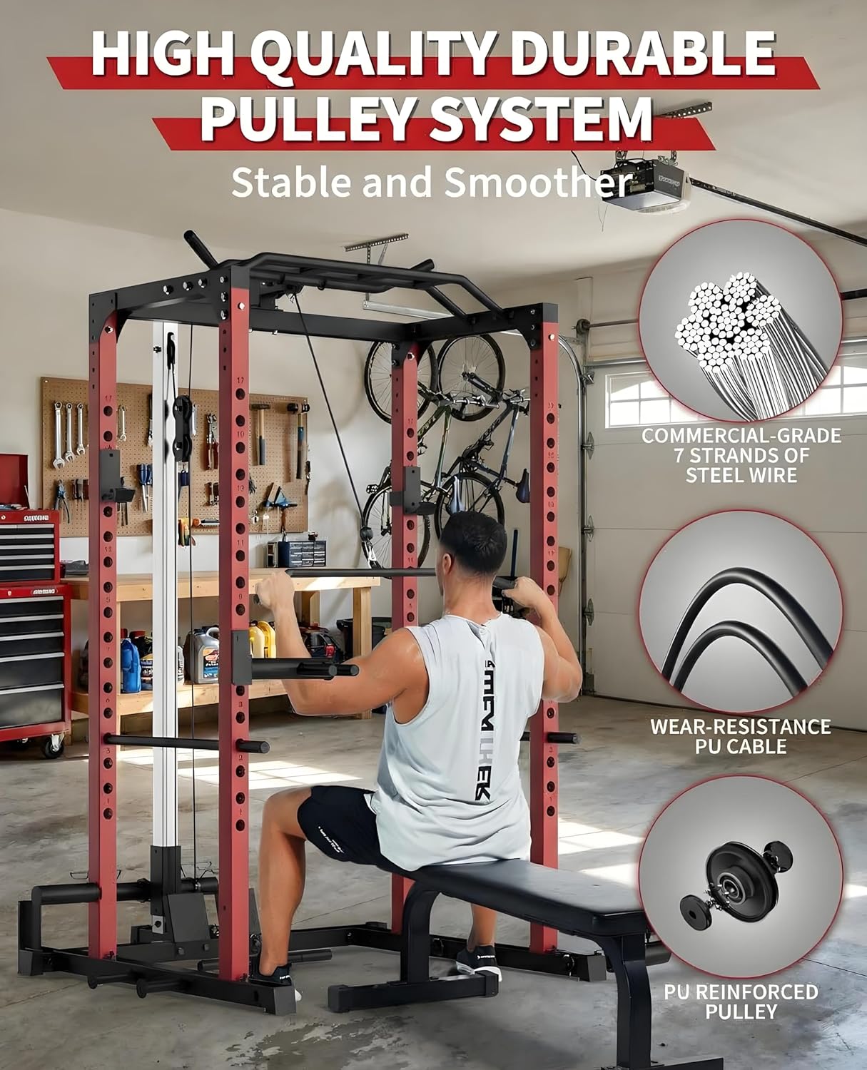【Power Cage for Versatile Home Workouts】The power cage integrates squat rack, lat pulldown, low row, and cable system into a single powerful station, enabling you to perform bench presses, squats, pull ups, dips, curls, and 50+ full body exercises.