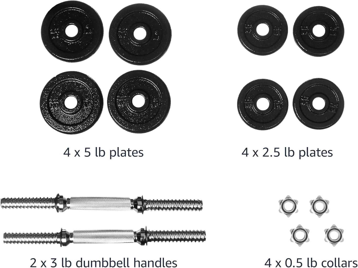 Set of 2 dumbbells (40 pounds total weight): TWO handles, FOUR 2.5-pound plates, FOUR 5-pound plates, and FOUR collars