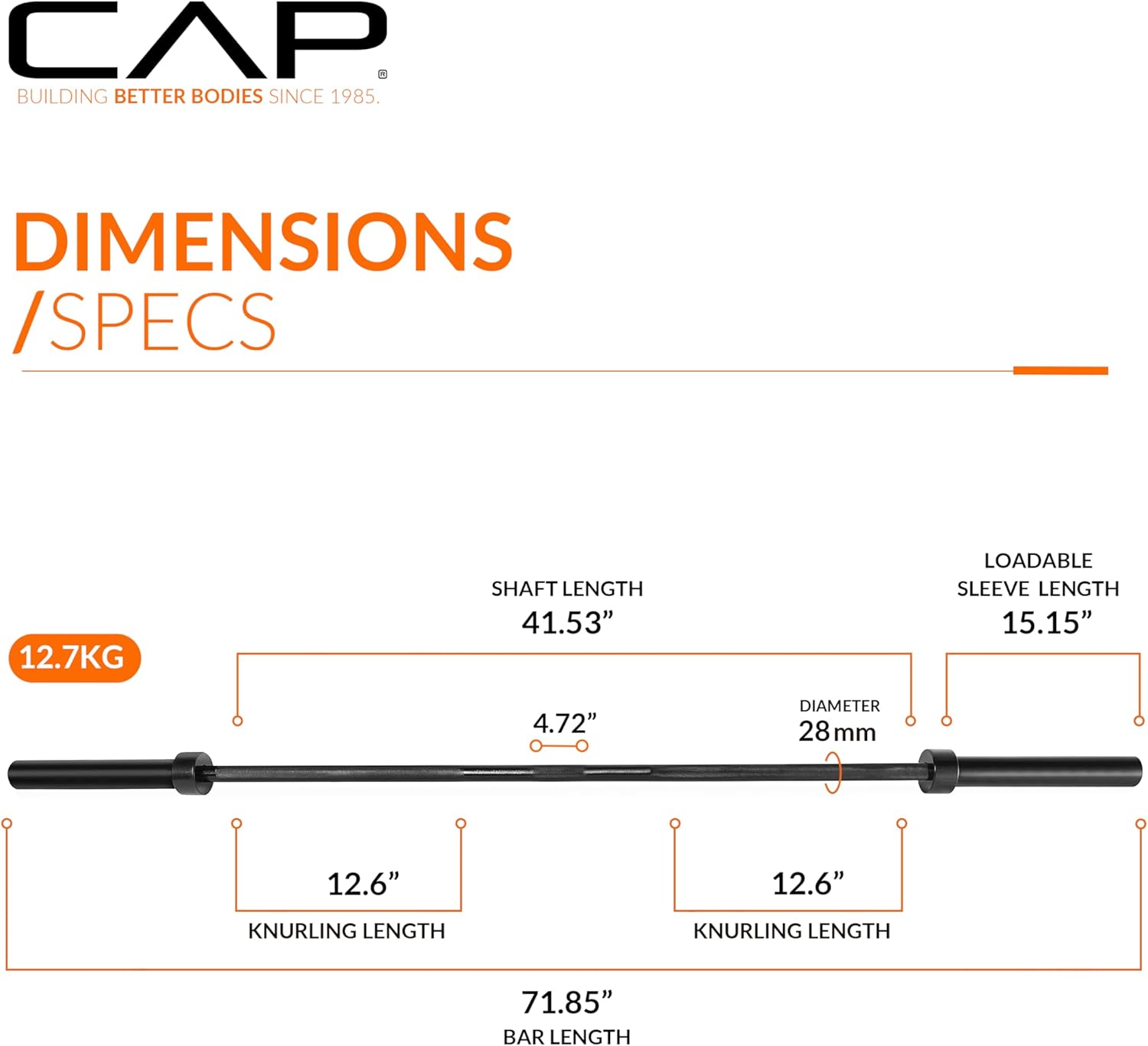 The CAP Barbell 6-Foot Solid Olympic Bar is constructed of solid cold rolled steel with a black powder coated finish and is built for balance and long-lasting performance. The bar’s compact design, measuring 1825mm in length, allows it to fit in any home or garage gym. Featuring medium-depth knurling, a 28mm handgrip diameter, and rotating sleeves with bushings, this bar offers a secure, non-slip grip and reduces pressure on the wrists and forearms when going heavy. The sleeves measure 11-inches in length, providing ample room to fit your Olympic weights with a 2-inch center hole on the bar. The shaft of this bar measures 45.75-inches between the sleeves (so be sure to measure your equipment to ensure the bar will fit prior to purchasing). The bar is made with 63,800 PSI tensile strength steel. Bar weighs approximately 28 pounds. 30-day manufacturer’s warranty*. (*) Please read CAP Barbell’s policy prior to purchase to understand what the warranty covers and what it does not.