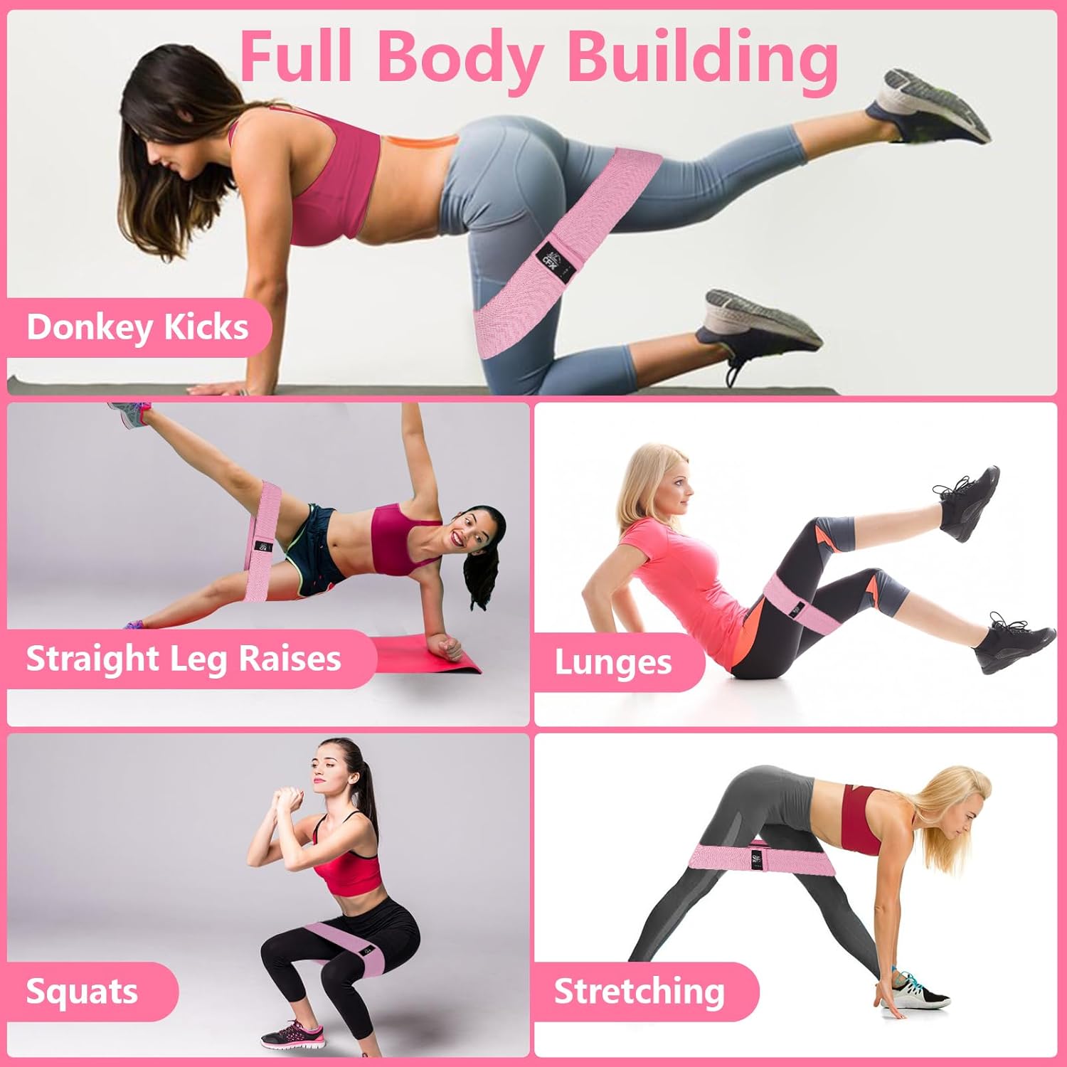 Exercise bands for women or men! You can do Pilates, Squats, Lunges, Glute Bridge, Donkey Kicks, Monster Walk, etc.