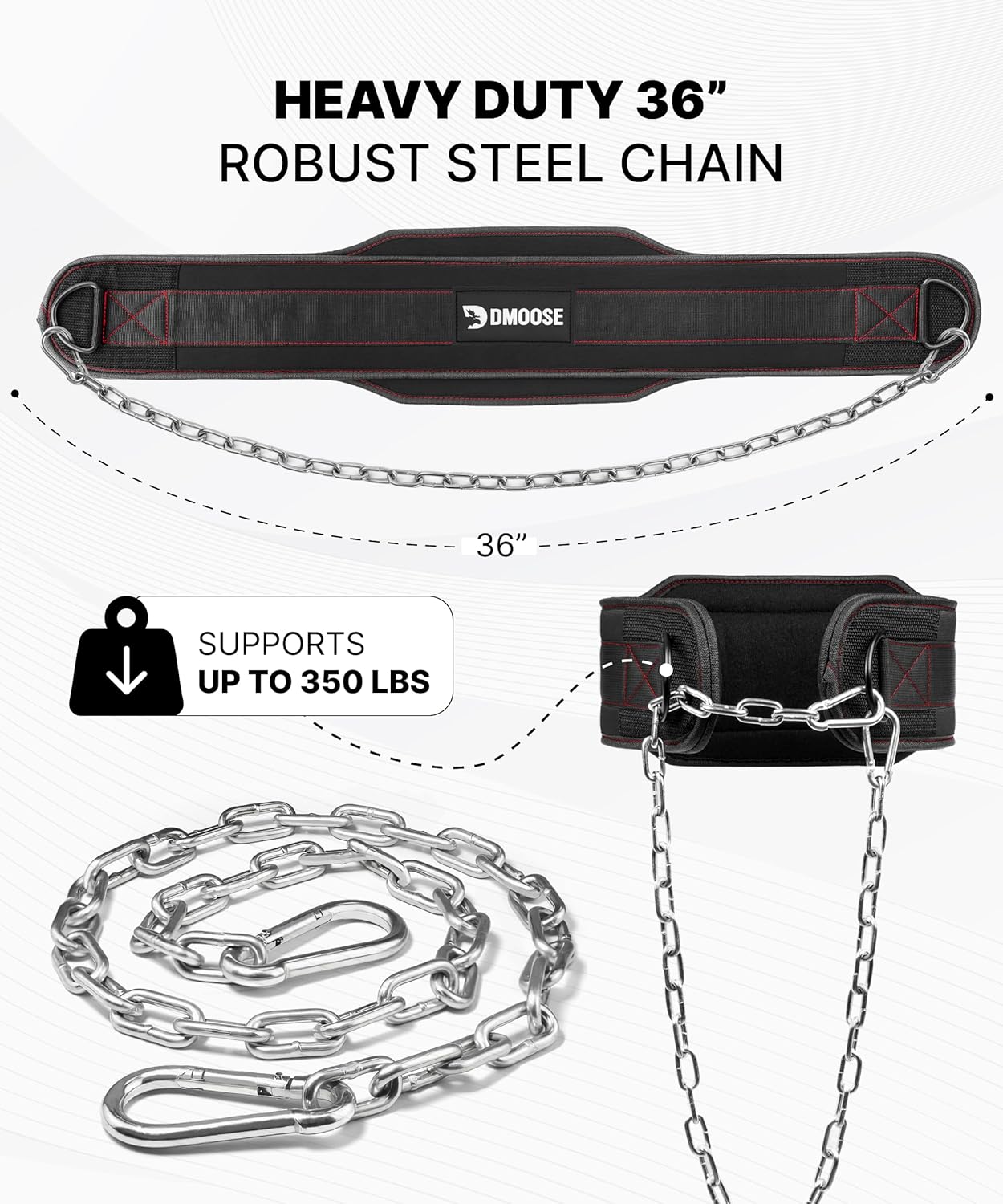 HEAVY DUTY ROBUST STEEL CHAIN: The DMoose Weighted Belt supports up to 350 lbs with a heavy-duty steel chain for secure plate/kettlebell attachment. Built for serious lifters, it provides unmatched stability & confidence for max gains.