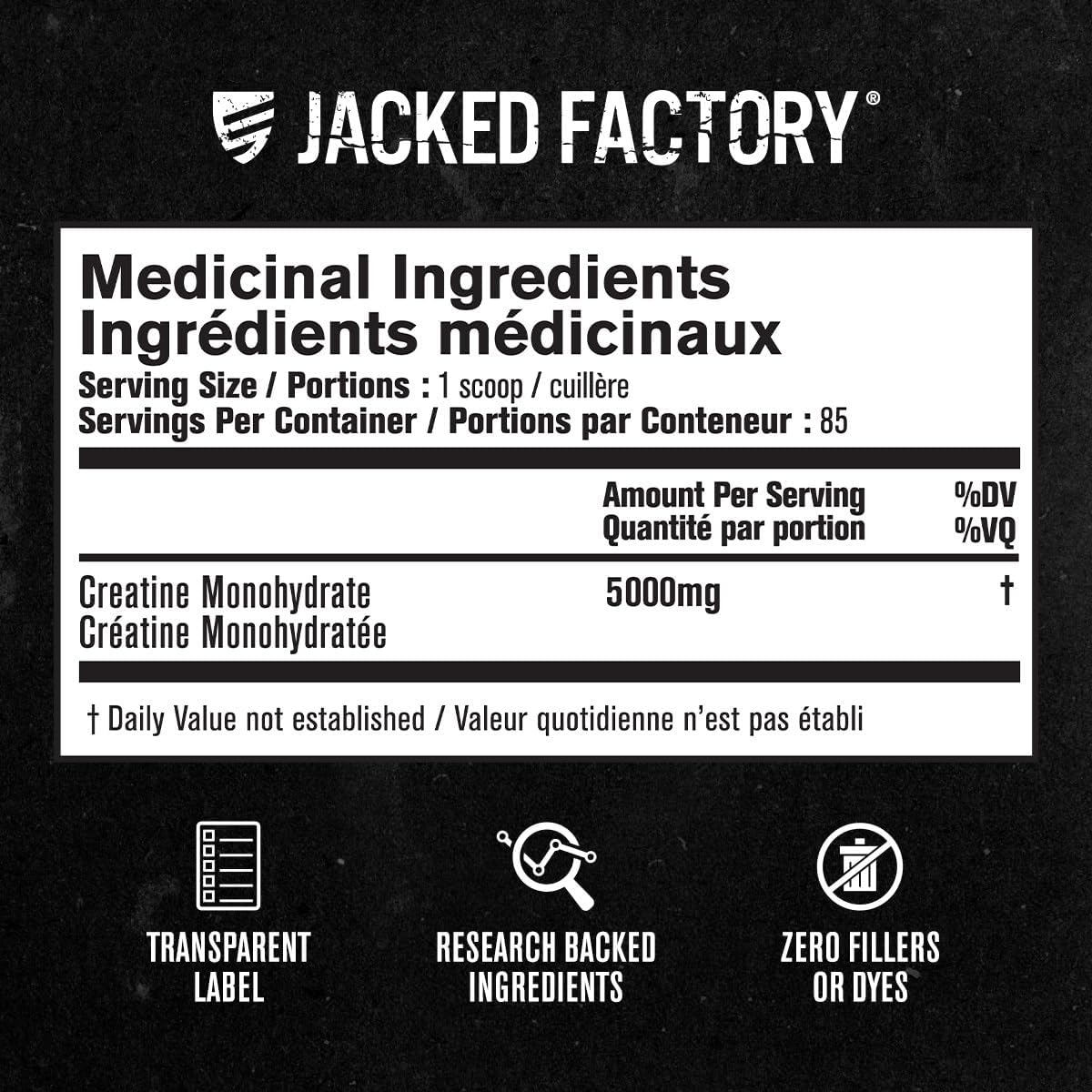Pure Creatine Monohydrate Powder: Jacked Factory Creatine Monohydrate powder features 5000mg of pure creatine monohydrate in every scoop. Our creatine powder mixes easily in any drink of your choice or it can be mixed with your favorite supplements such as pre-workout, protein, and BCAAs.