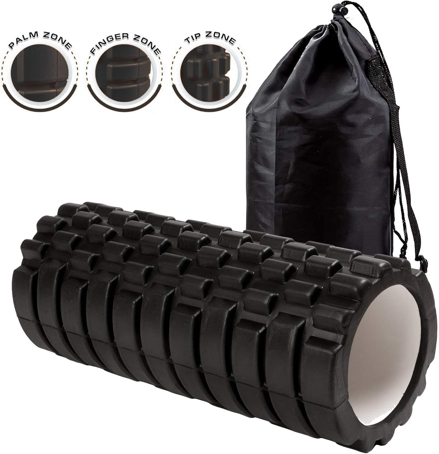 13 inches x 5.5 inch diameter , lightweight yet rugged solid core massage roller with EVA tread and triple grid 3D massage zones mimics the finger , palm , and thumb of a therapist’s hands .