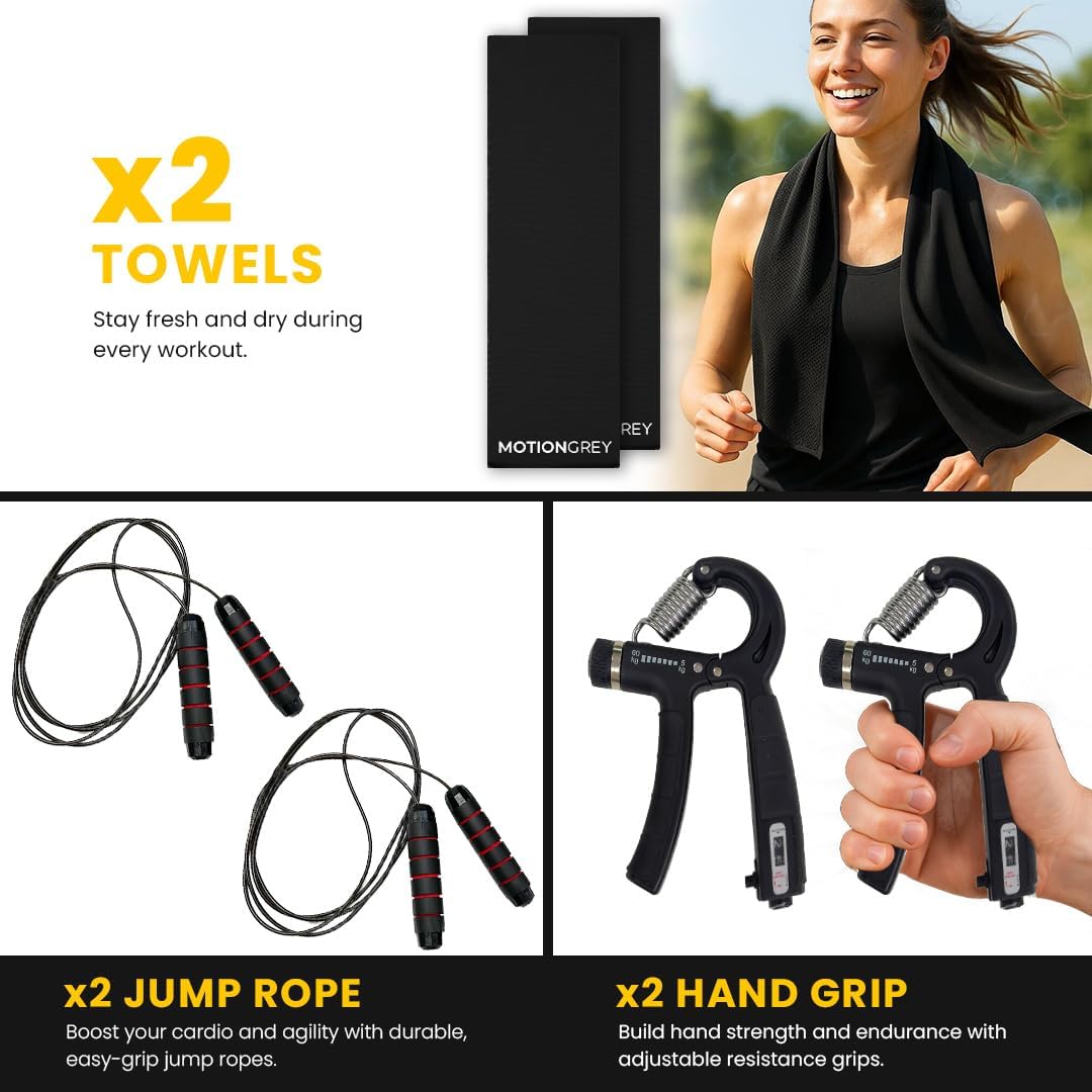 Additional Accessories Included: 2 Hand Grips + 2 Jump Ropes + 2 Performance Towels : Enhance your training with two included resistance hand grips,jump ropes, and towels. Perfect for cardio, warm-ups, and grip strength training. A complete set for full-body workouts.