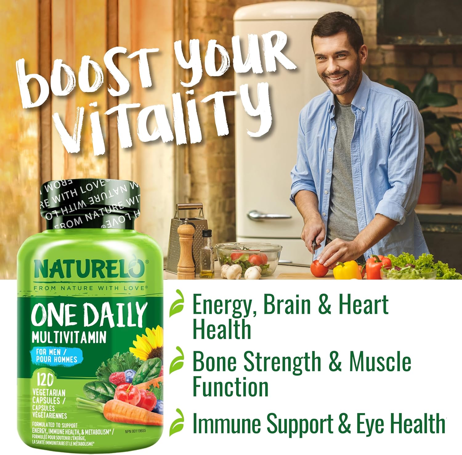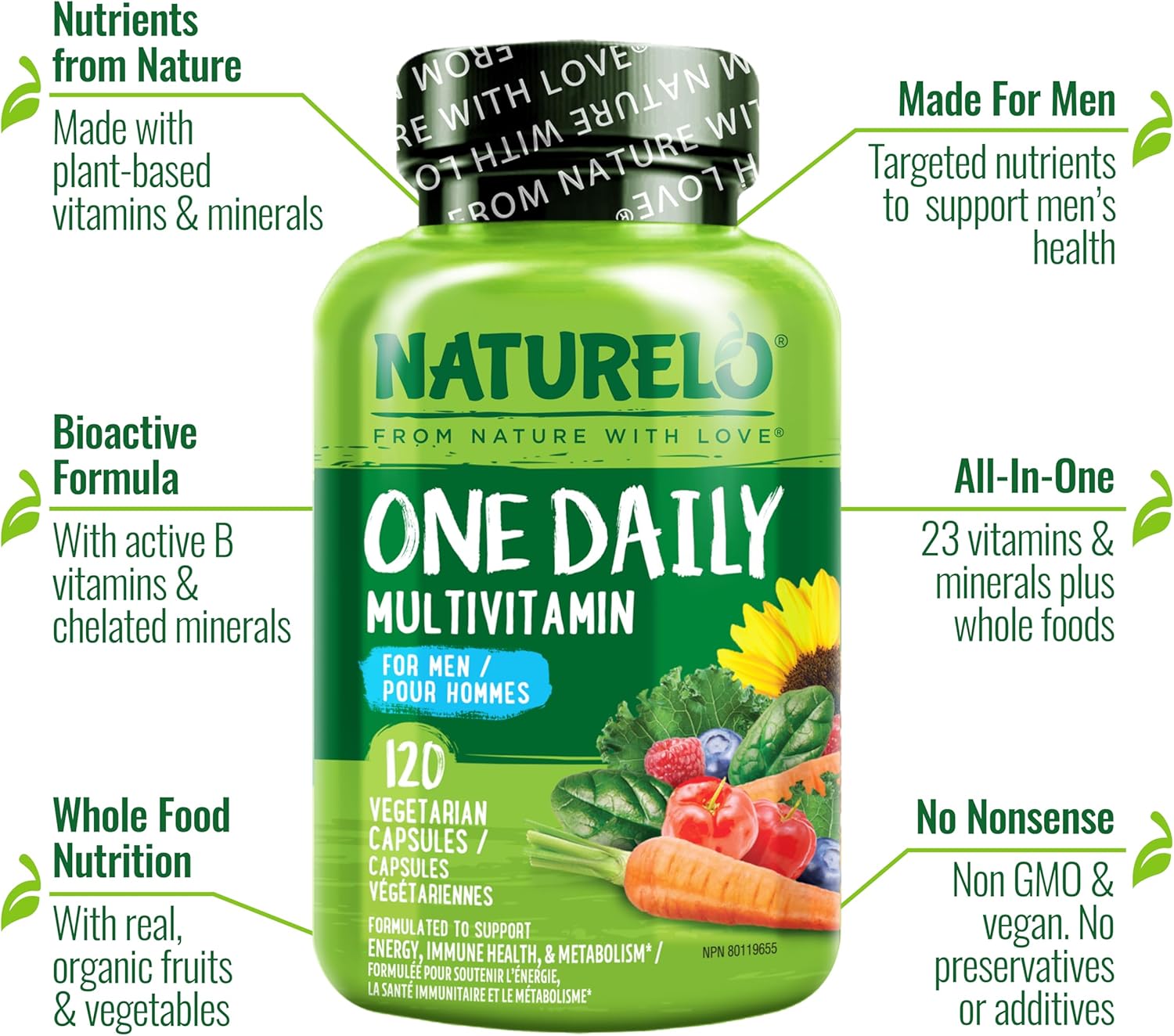 MULTIVITAMIN FOR MEN: The NATURELO One Daily Multivitamin for Men is an multivitamin that blends 23 essential men vitamins and supplements, along with organic fruits and vegetables, in a convenient daily dosage.