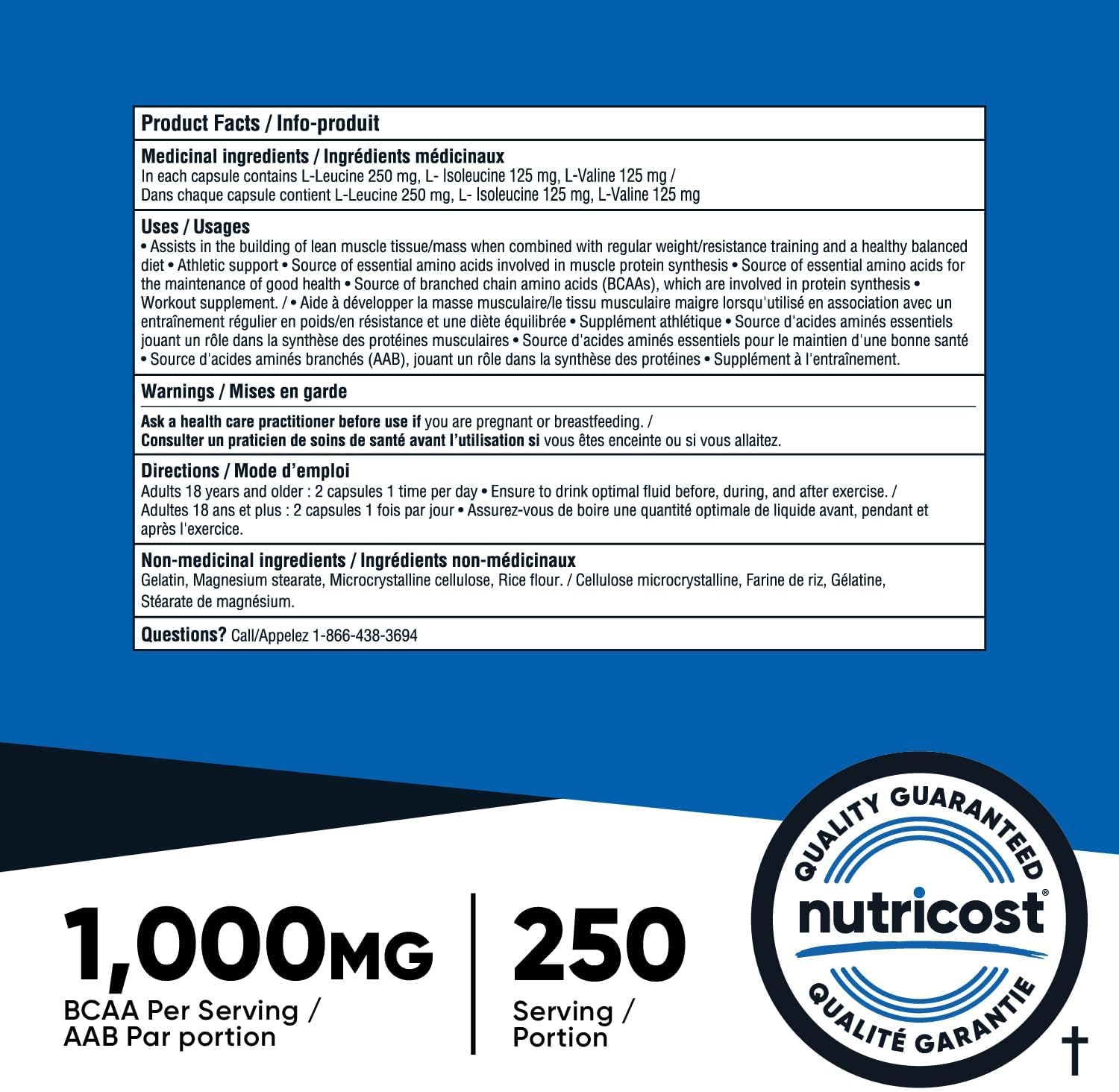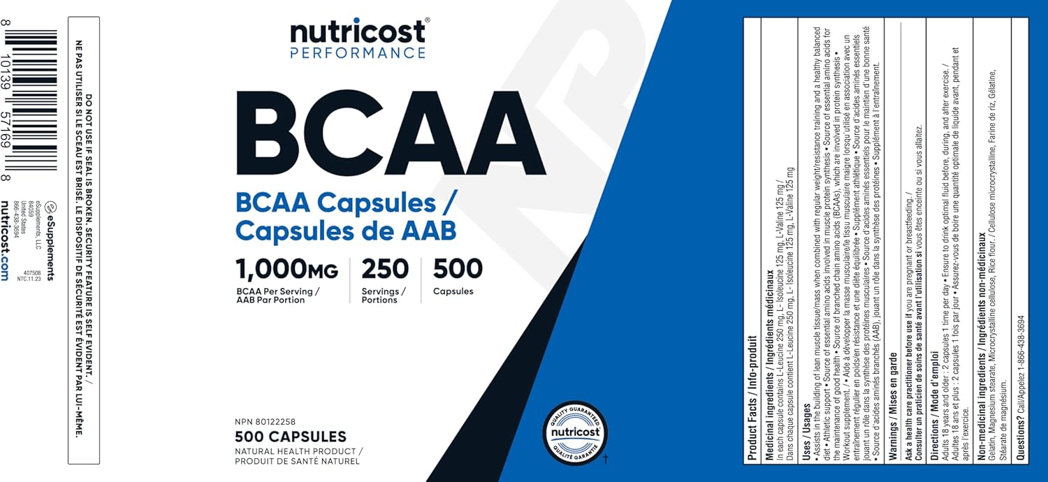 Nutricost’s BCAA capsules deliver 1,000 mg of Branched Chain Amino Acids (BCAAs) per serving in the 2:1:1 ratio of Leucine (500mg) to L-Isoleucine (250mg) and L-Valine (250mg). There are 500 capsules for 250 servings per bottle. Nutricost, located and headquartered in the USA, only uses the best ingredients to ensure maximum quality and to help you feel your best! By keeping our supplement recipes simple and clean, you get the best experience possible with Nutricost. Our supplements are manufactured in a GMP-compliant and FDA-registered facility; and each batch of every product is tested by independent, ISO-accredited laboratories.
