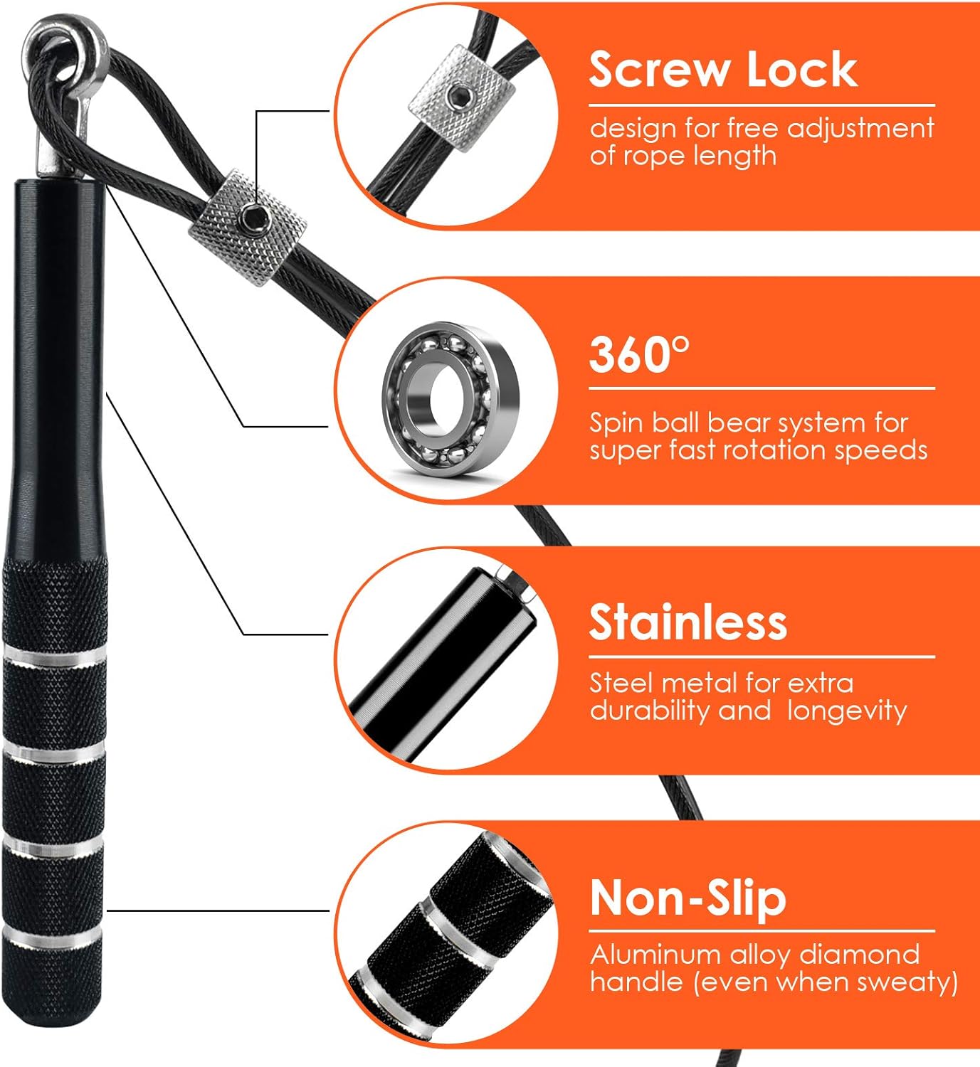 💪𝗦𝘁𝗲𝗲𝗹 𝗕𝗮𝗹𝗹 𝗕𝗲𝗮𝗿𝗶𝗻𝗴𝘀 𝗙𝗼𝗿 𝗦𝗽𝗲𝗲𝗱 – Our exercise jump rope weighted just enough to feel the rope spin, giving you more control. Plus unique, spherical ball bearing design allows rope to spin more freely and smoothly, reducing friction and increasing speed , this training ropes brings you desirable double unders and high speed skipping.