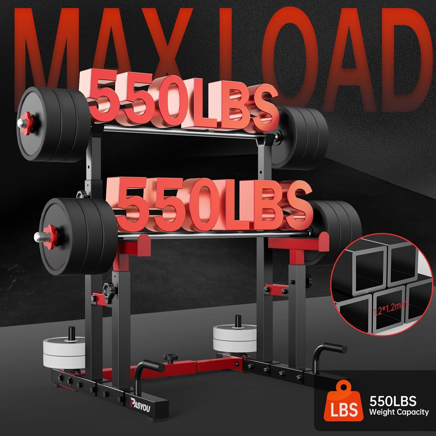 【Heavy-duty construction for enhanced safety】PASYOU adjustable squat rack is made of high-quality steel, ensuring excellent durability and stability. It can withstand a maximum load of 550lbs, suitable for serious strength training and giving you peace of mind during high-intensity workouts. Its tube width is 2″*2″; and there are four foot pads at the bottom of this squat rack to make this machine more stable when in use.