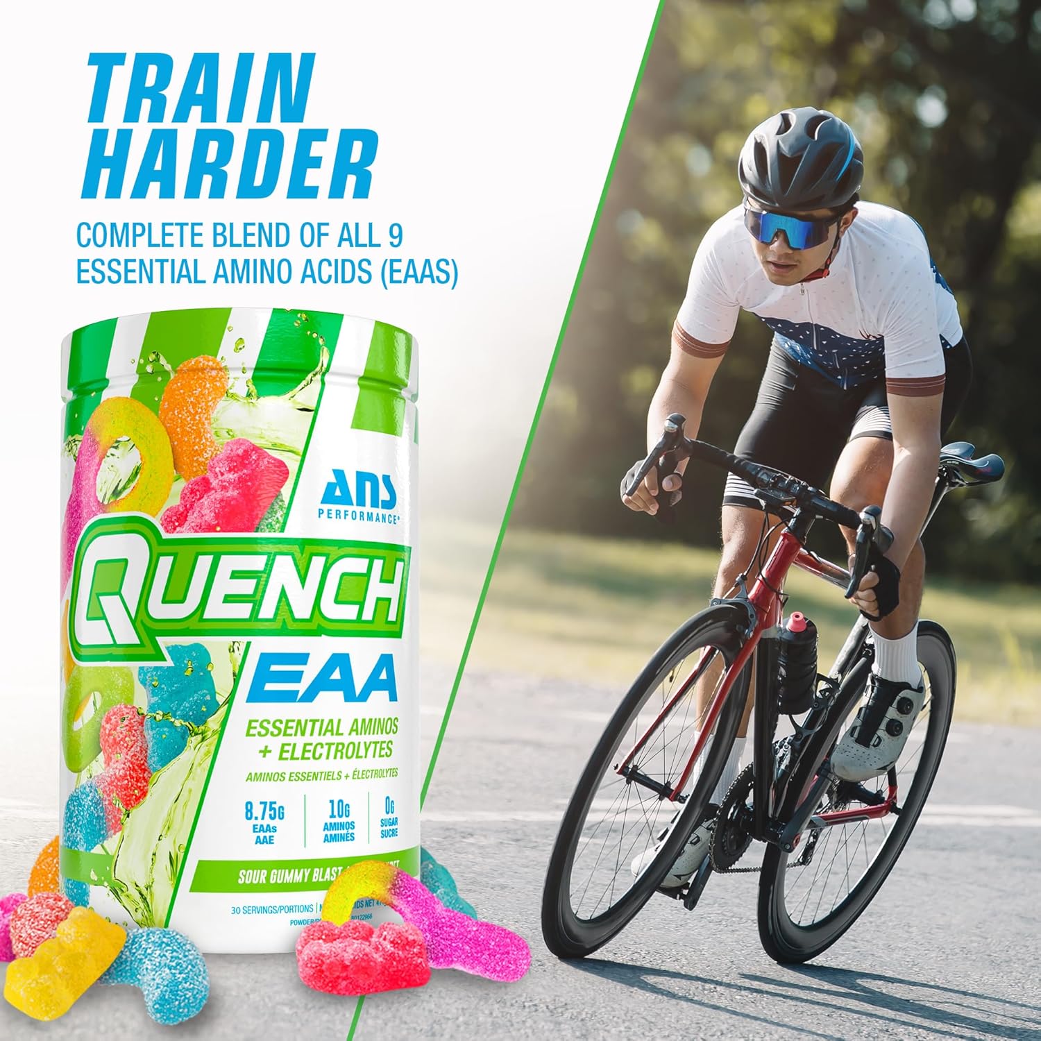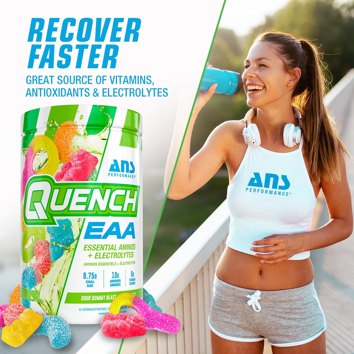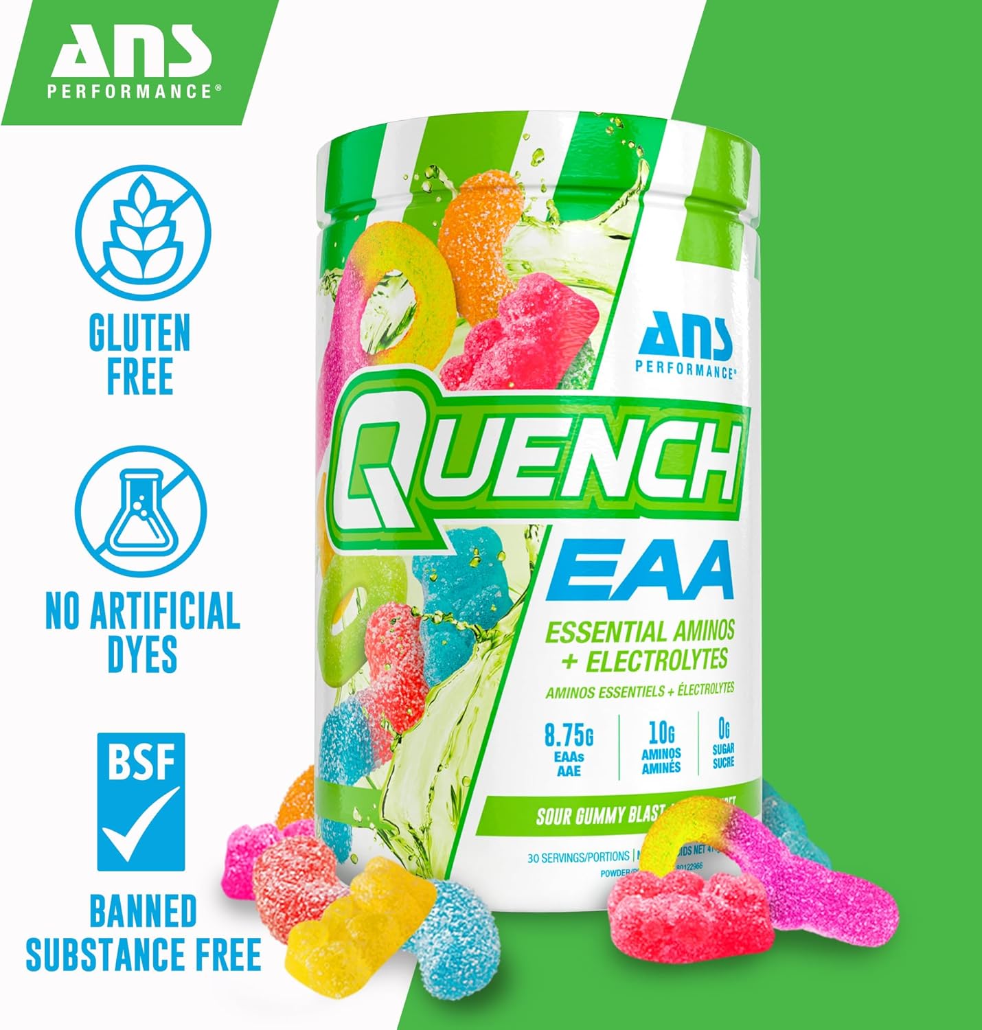 QUENCH EAA Aminos + Electrolytes – Complete Blend of 9 EAAs – 10g Total Amino Acids – Vitamins, Antioxidants, Electrolytes – ZERO Sugar, Carbs, Calories (Sour Gummy Blast)