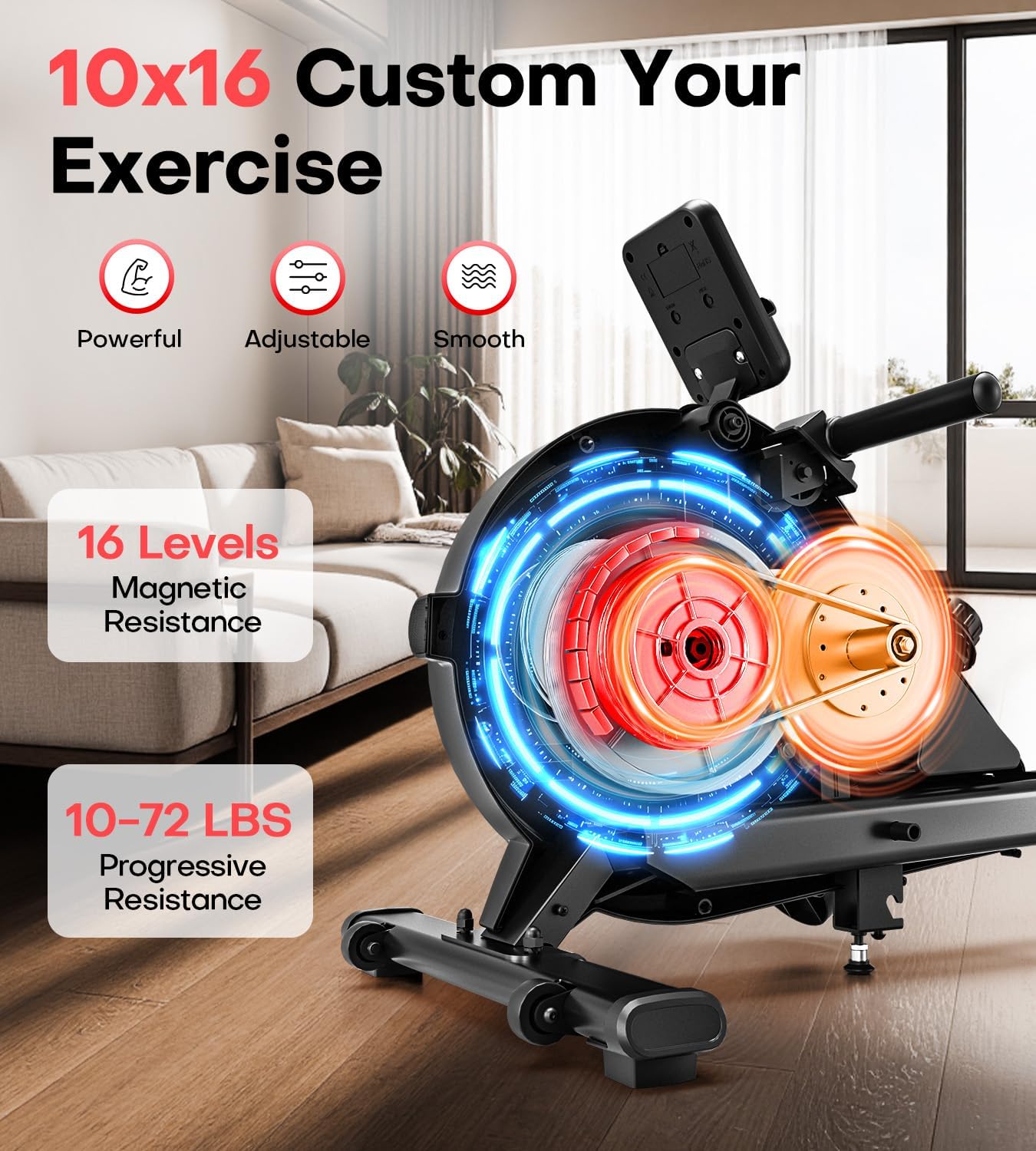 16-Level Magnetic Resistance: Our rowing machine is equipped with a high-quality magnetic control system and an improved, 16-level adjustable resistance. This allows users to find the optimal resistance intensity for their needs, whether they’re seniors undergoing rehabilitation training or fitness enthusiasts looking to build muscle. Unlike other home rowing machines with 8 levels, the 16-level resistance offers a more varied exercise experience.