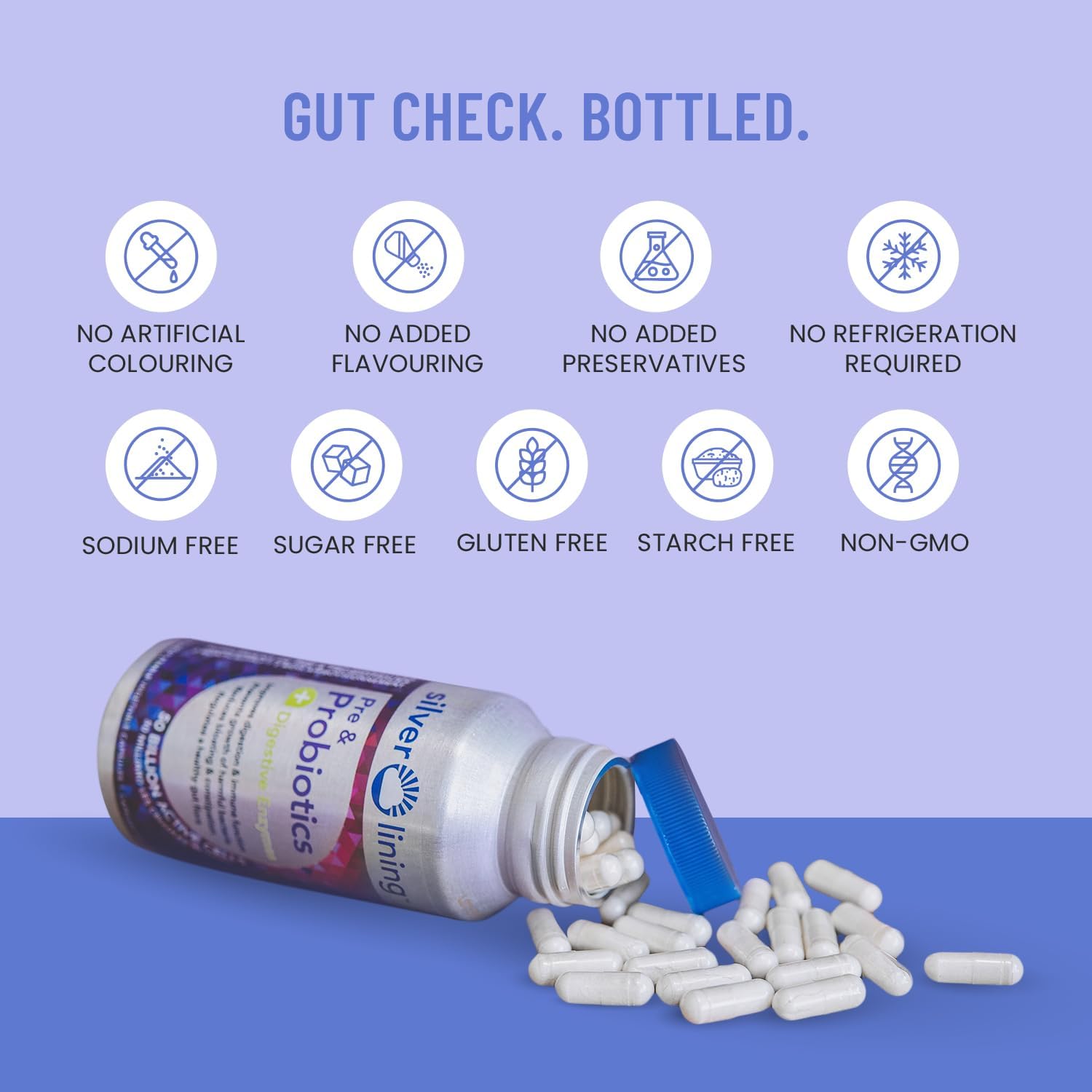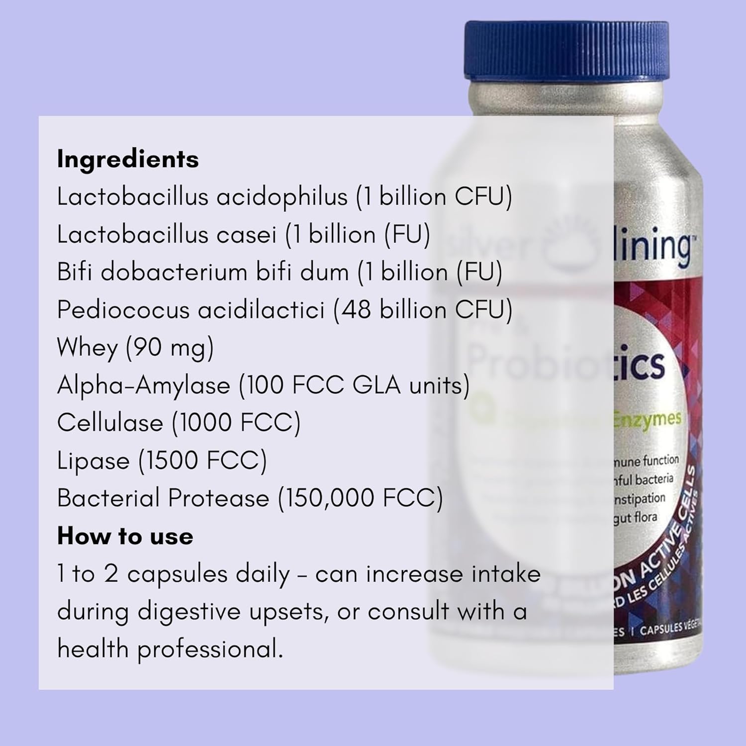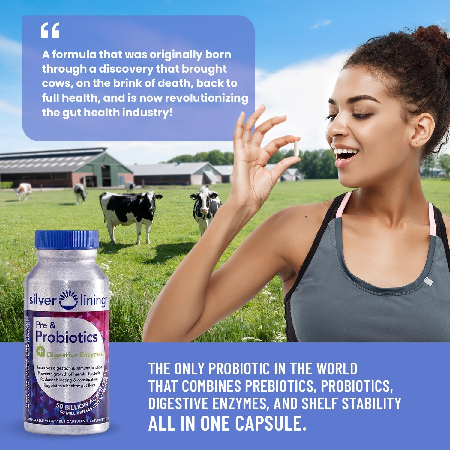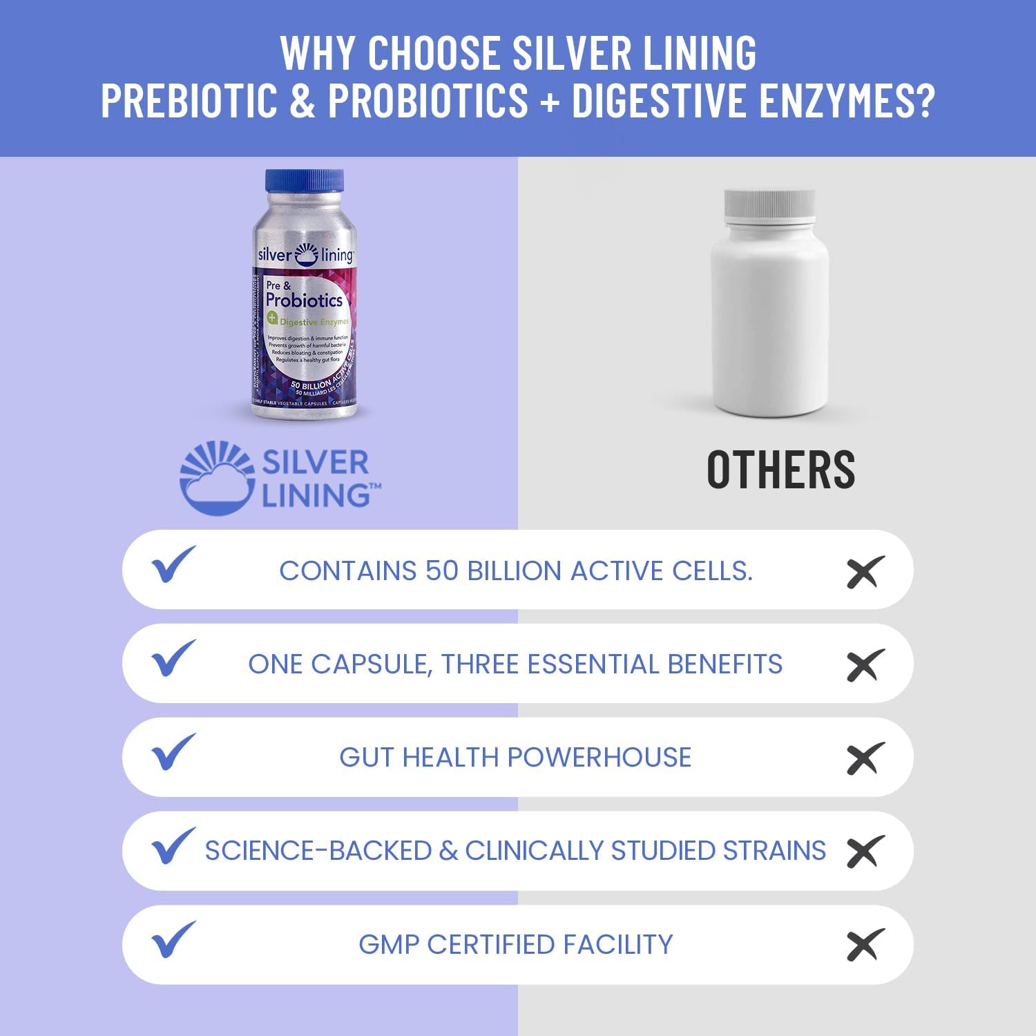 Silver Lining Pre & Probiotics + Digestive Enzymes Supplement Discover the ultimate solution for digestive health with Silver Lining Pre & Probiotics + Digestive Enzymes, an expertly crafted supplement designed to support gut health, boost immunity, and enhance overall well-being. This advanced formula combines prebiotics and probiotics in one, along with powerful digestive enzymes for women and men, to deliver comprehensive digestive and immune support for all. Packed with 50 billion active CFUs, this supplement features a powerful blend of probiotics—including Lactobacillus acidophilus, Lactobacillus casei, Bifidobacterium bifidum, and Pediococcus acidilactici—alongside digestive enzymes such as alpha-amylase, cellulase, lipase, whey-derived enzymes, and bacterial protease. This synergistic formula supports a healthy gut flora balance, promotes smooth digestion, and enhances nutrient absorption. Ideal for adults seeking from bloating relief, IBS relief and gas relief for adult. The shelf-stable formula maintains full potency without the need for refrigeration, offering reliable, on-the-go support that fits seamlessly into any lifestyle. Whether you’re seeking a women’s probiotic, or a complete pre/probiotic supplements, Silver Lining delivers a convenient, all-in-one solution to support your gut health anytime, anywhere. Key Benefits: – Men’s and womens supplements supports gut health with probiotic strains – Digestion supplement with premium enzymes for digestion for a smoother digestive process – Pre and probiotic for women and men that boost immunity by supporting gut health. – Probiotics & prebiotics for women and men that reduce bloating and ease discomfort, providing a lighter, more energized feeling – Men & women probiotic and prebiotic in convenient, shelf-stable capsules with 50 billion active cells for maximum effectiveness. Unlock the secret to a healthier gut and a vibrant you with Silver Lining Pre & Probiotics + Digestive Enzymes Supplement