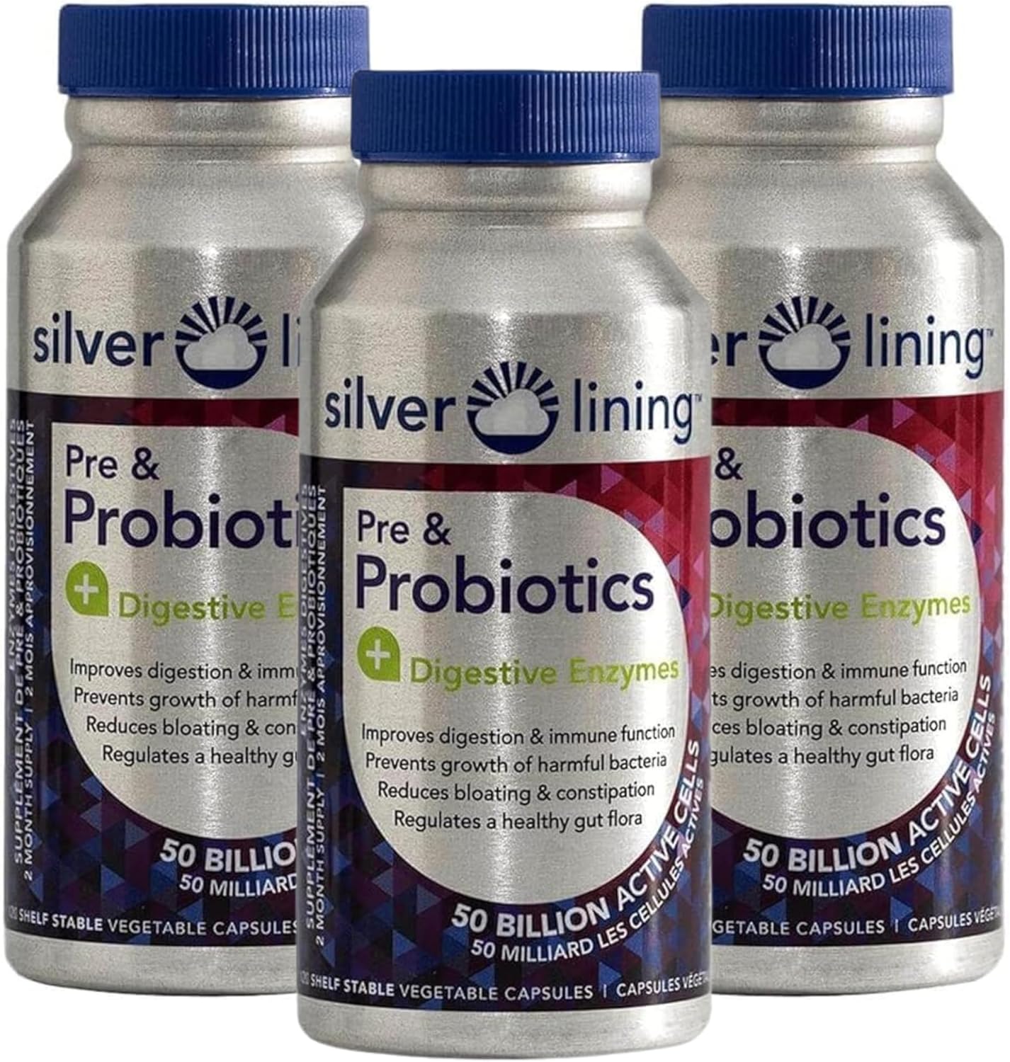Silver Lining Prebiotics & Probiotics for Women & Men + Digestive Enzymes, Digestion Supplement for Gut Health, Prebiotic and Probiotic in One for Immune Support, 360 Capsules, Pack of 3
