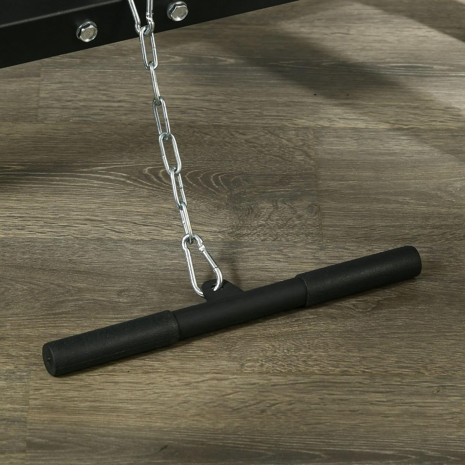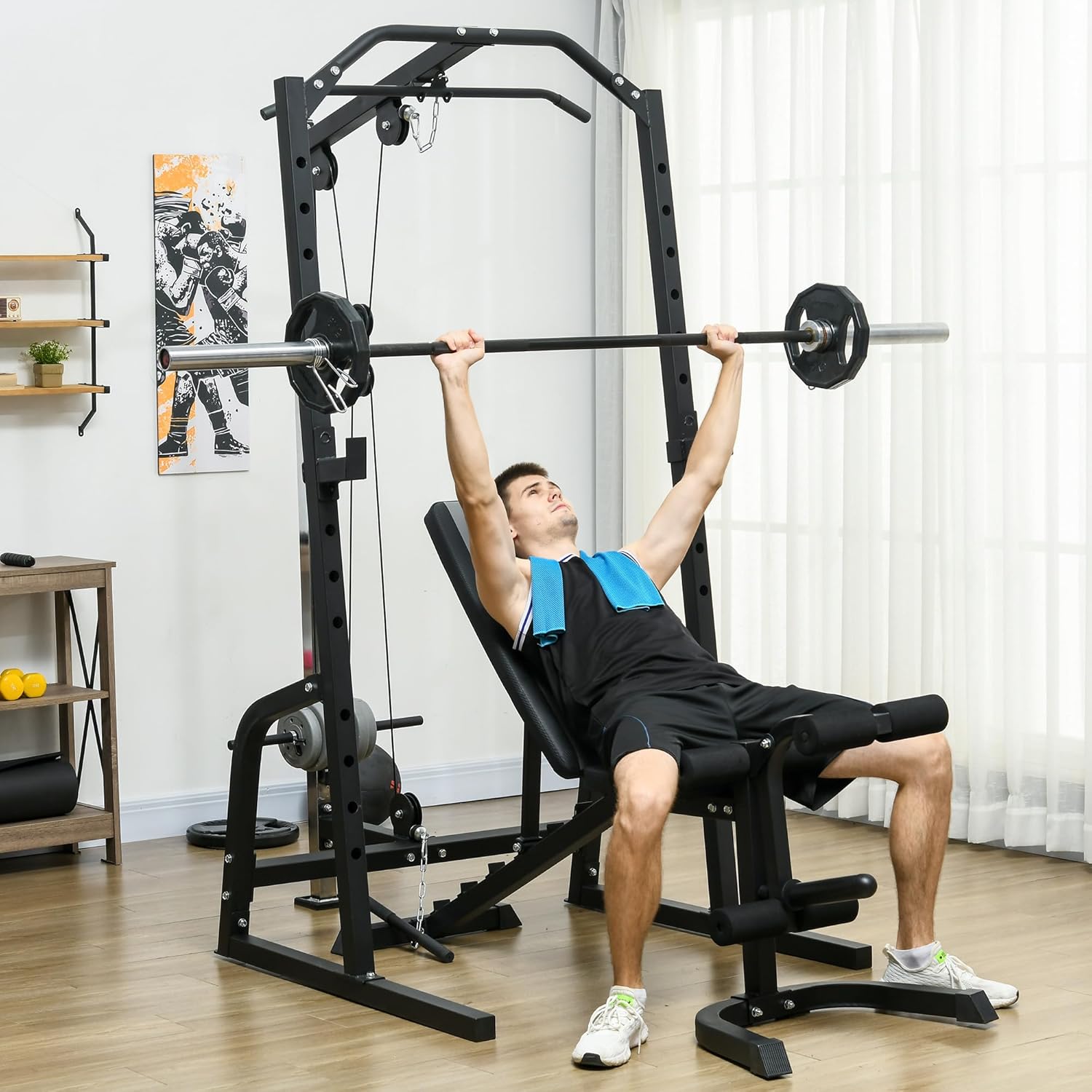 Home Gym Frame: This gym equipment for home allows you to work your arms, legs, shoulders, back, and chest with a pull up station, barbell rack, lat pull-down bar, low row bar, and leg lift rollers.