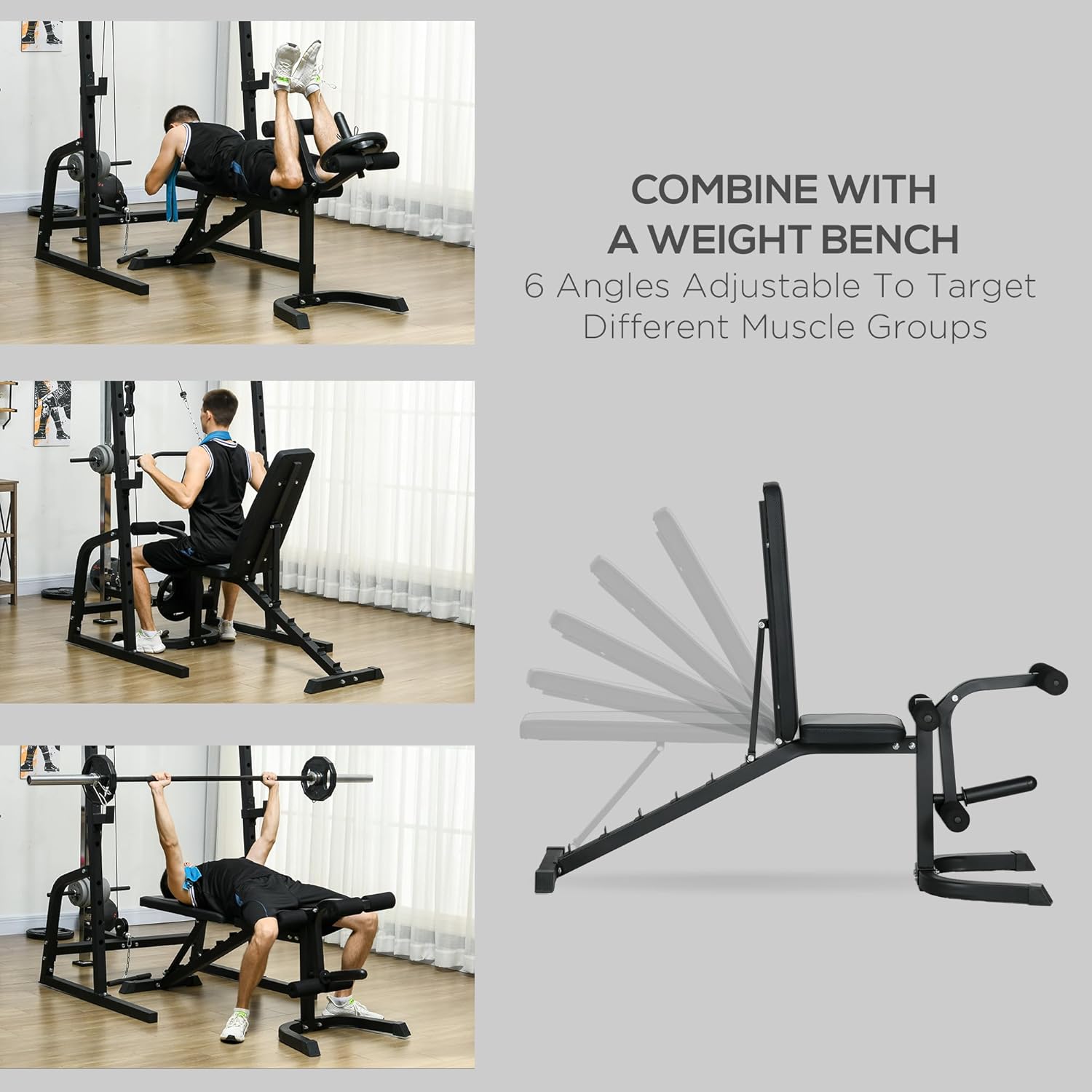 Soozier Home Gym Machine, 3 in 1 Smith Machine, Multi-Functional Power Cage with Adjustable Weight Bench, Barbell Bar and Cable Pulley System, 15-Level Squat Rack, Black