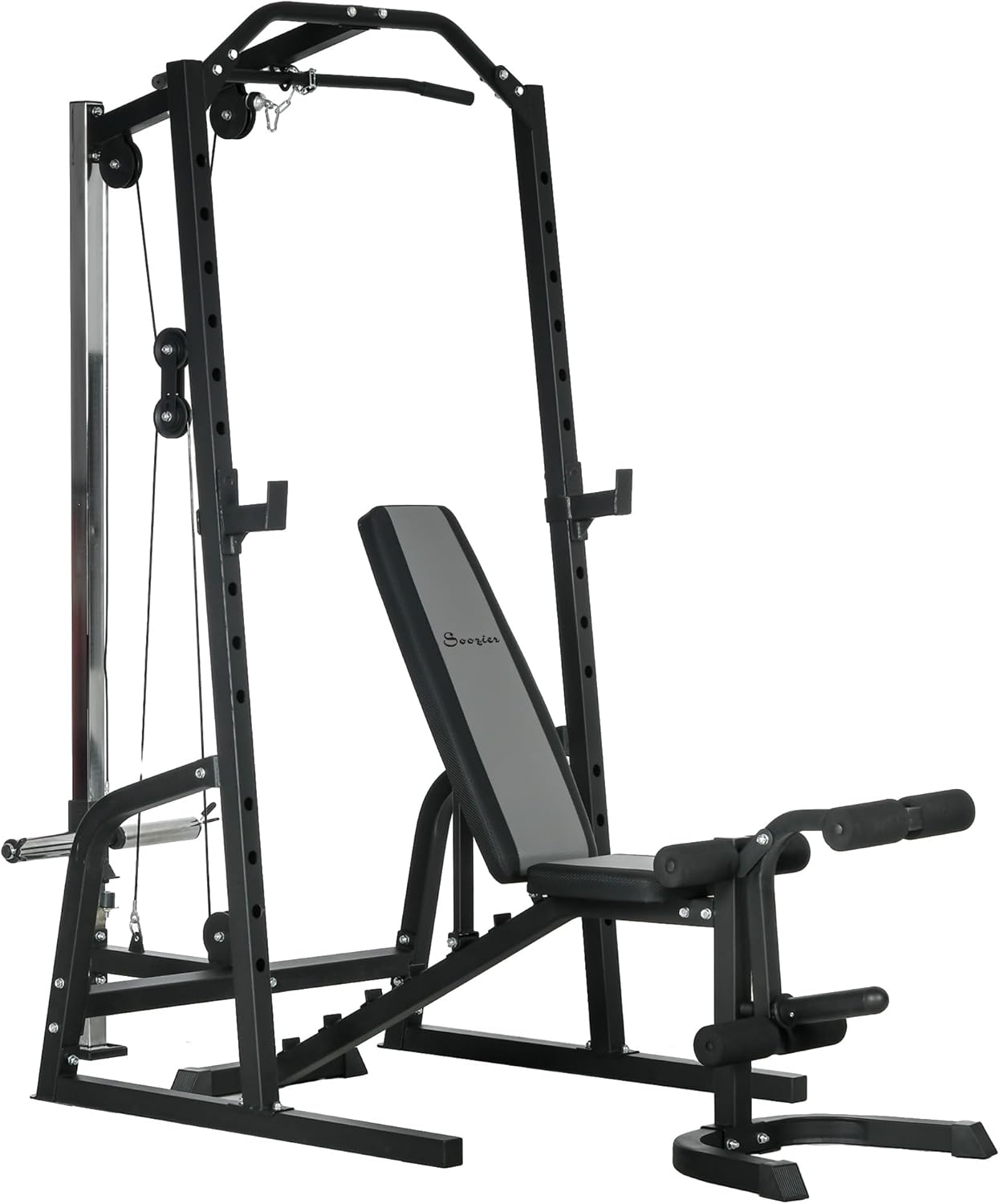 Easily integrate combined exercises into your home gym with the Soozier power cage and weight bench. Utilize a squat rack and bench set for bench presses, incorporate pull-ups, lat pull-downs, twists, and rows into your regimen. Our frame features a built-in cable system supporting resistance up to 110 lbs. (50 kg) and a leg lift apparatus for up to 55 lbs. (25 kg). Looking to gain strength? Simplify the process by using our strength frame at home, on your time, as your routine requires.