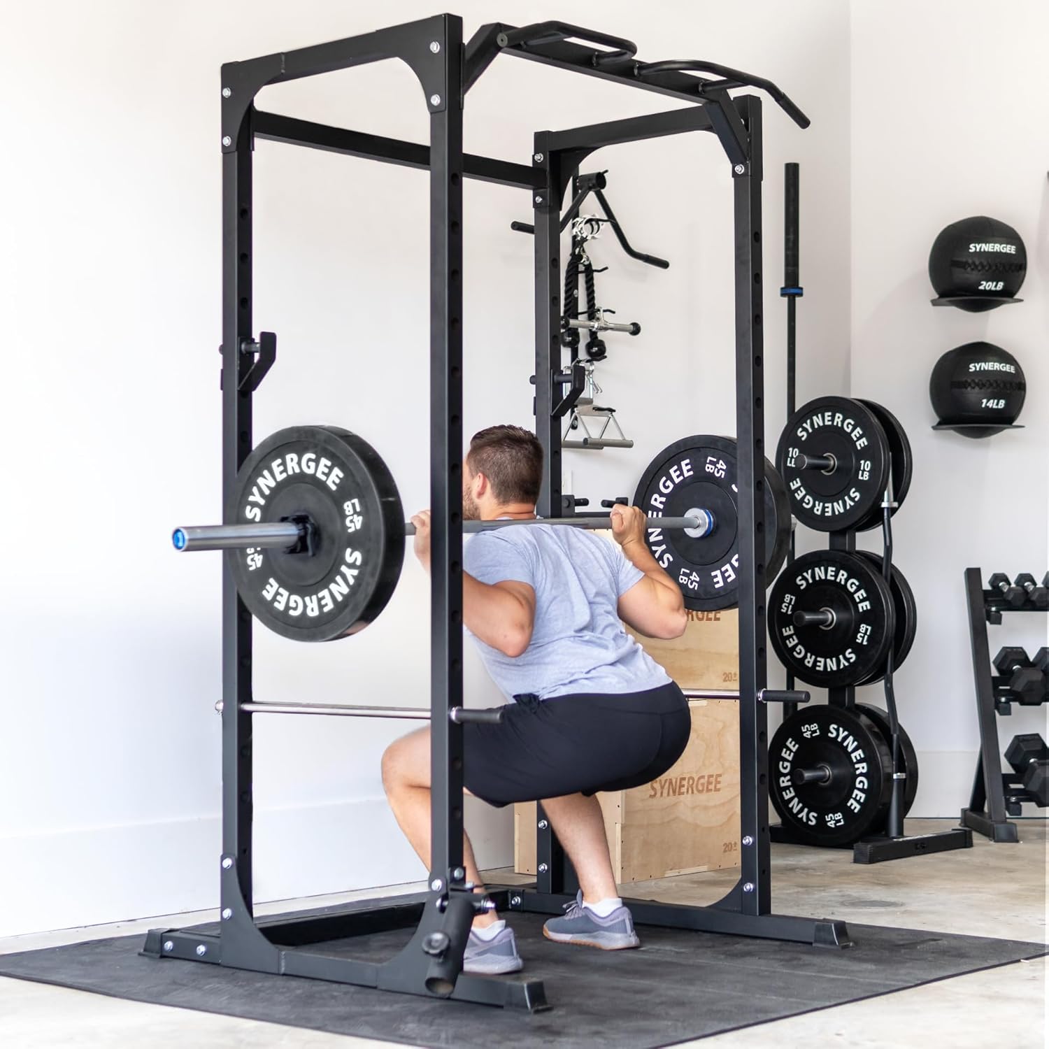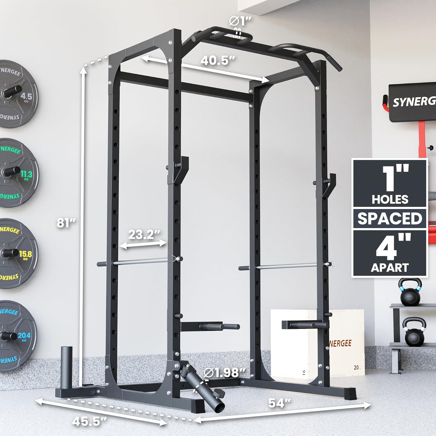 ★ WHAT’S IN THE PACKAGE★ – This Power Rack comes with J Cups, Safety Arms, a Pull Up Bar, Landmine & T Bar Attachment, a Barbell Holder and Dip Station Attachment. Installation is required and instructions as well as necessary hardware required for assembly are provided. The Synergee Power Rack stands 81″ tall on a 44.5″ x 51″ base and 750 lb weight capacity.