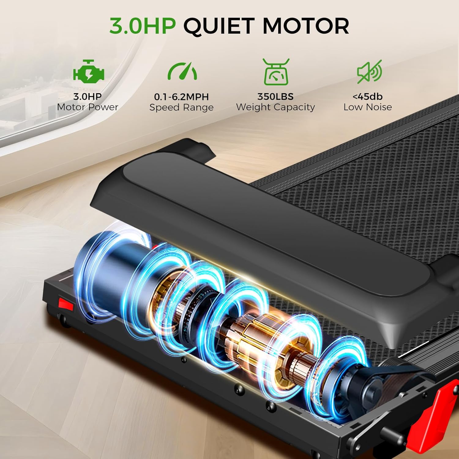 🔇 【Low-Noise 3.0HP Brushless Motor】The home treadmill features a commercial-grade 3.0HP brushless motor that operates below 45 dB—quieter than a normal conversation. Supporting speeds of 0.6–6.2 mph and a 350 lb load capacity, this incline walking pad delivers powerful yet quiet performance ideal for home use. Perfect for family- friendly workouts without disturbing others.