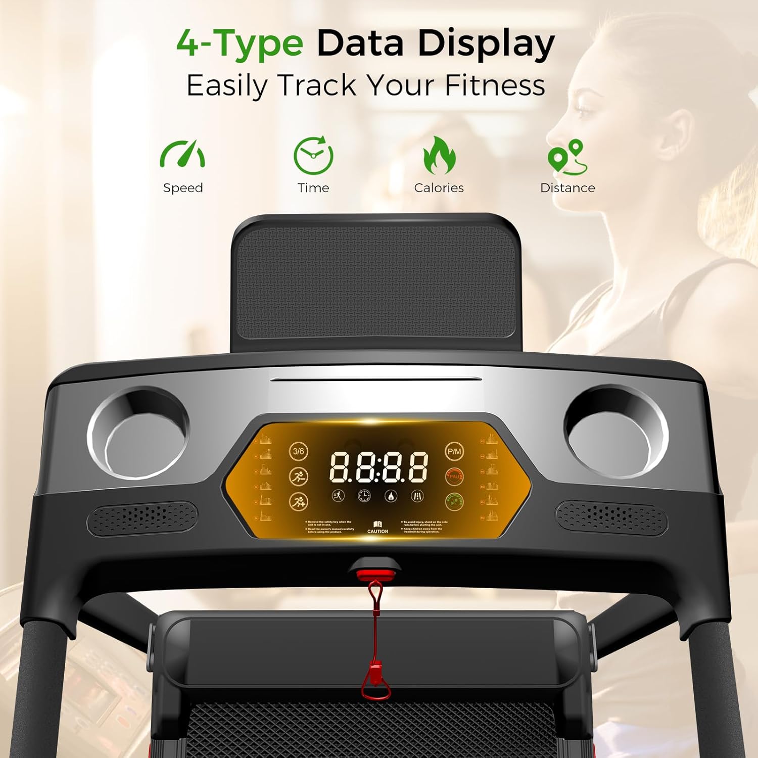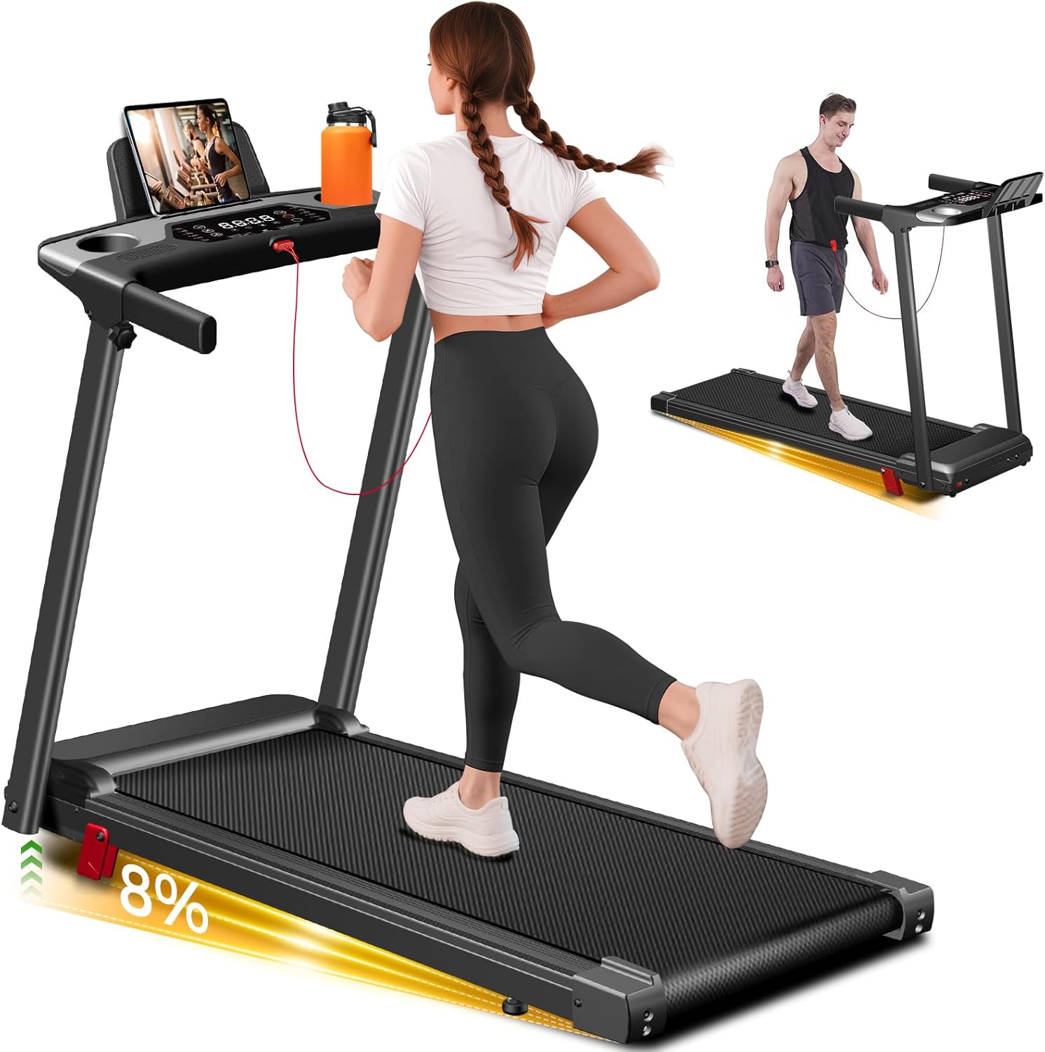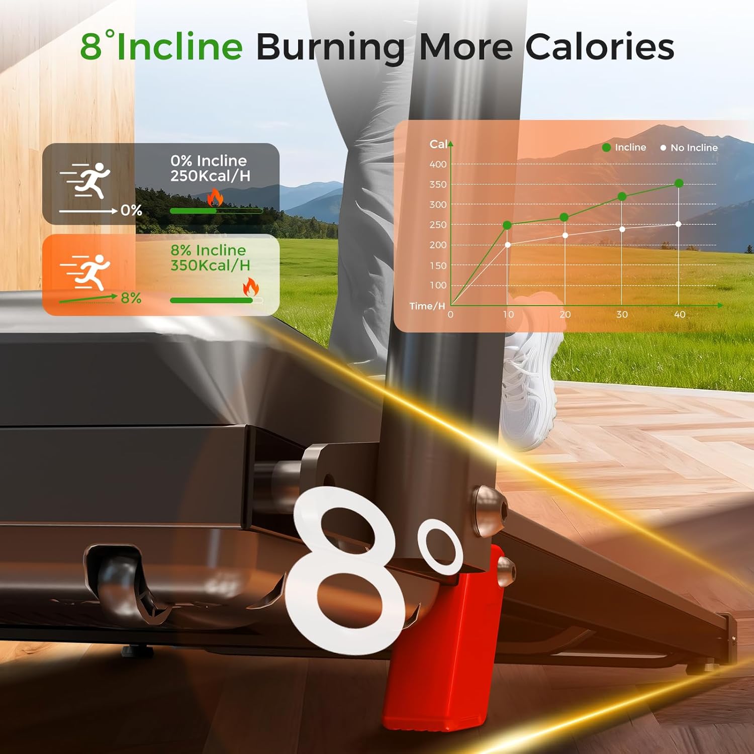 ⛰ 【8% Manual Incline Treadmill】This foldable treadmill features an 8% manual incline, easily adjusted with red foot pads to simulate realistic terrain. Perfect for home workouts, this incline treadmill intensifies your routine to maximize calorie burn and training efficiency in the same amount of time.