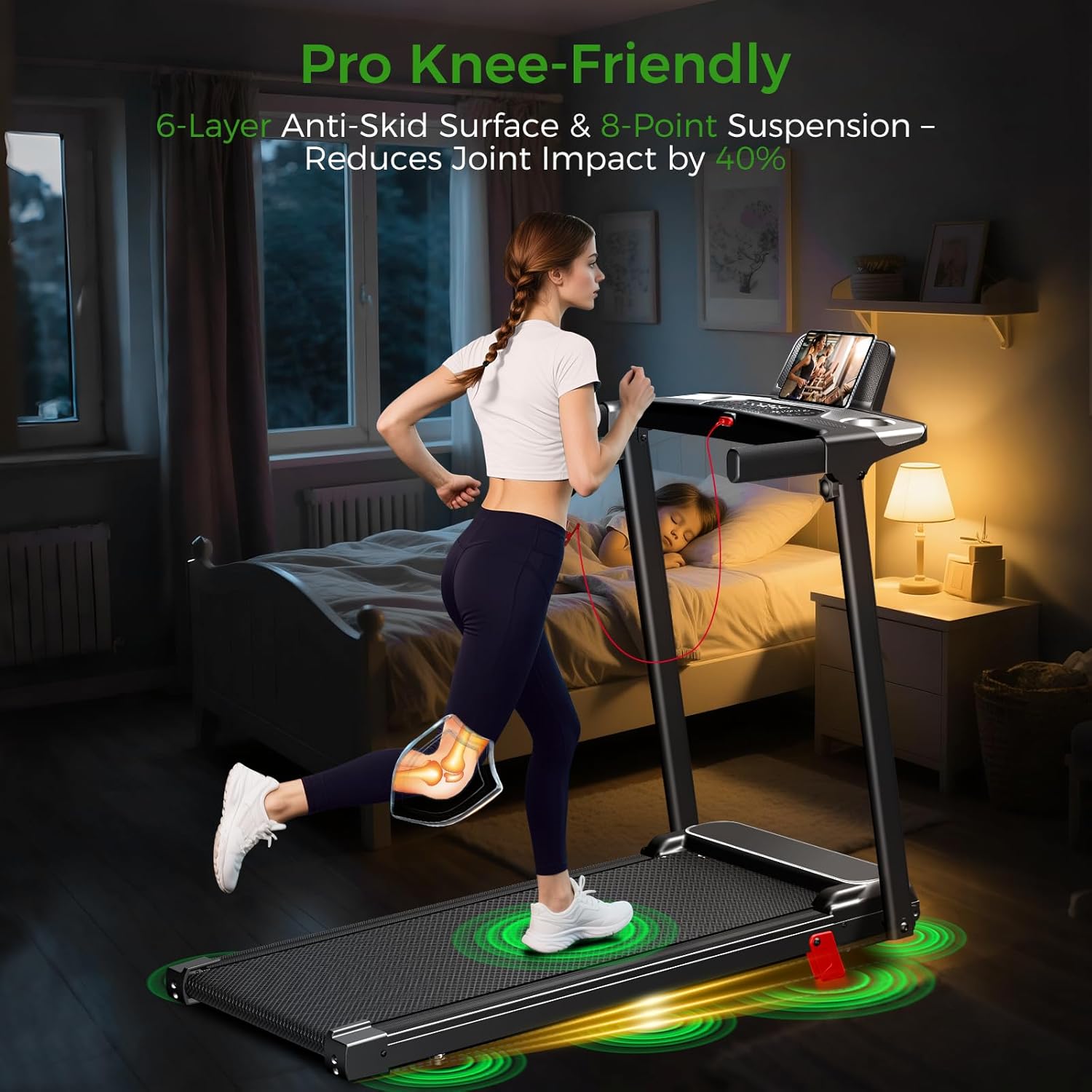 🏃‍ 【Lightweight & Compact Treadmill】This running treadmill for home is designed for easy mobility, weighing only 41.9 lbs! Its built-in transport wheels allow you to fold and store it in seconds — effortlessly tuck it under a bed or in a closet. Perfect for apartments and small spaces, this folding treadmill creates your instant home gym without claiming any permanent floor space.